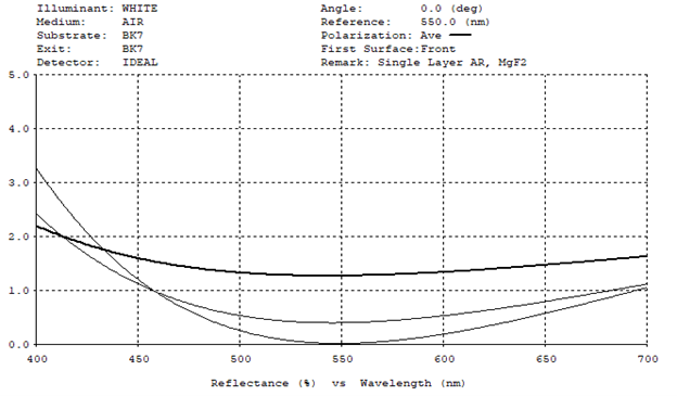 The coating curve below (figure 1) illustrates a single layer MgF2, centered at 550nm at normal incidence. The various curves chart different glass types with varying indexes of refraction. The dark top line is N-Bk7 substrate with Nd = 1.517. The middle line is SF5 with Nd = 1.673 and the lower SF57 substrate with Nd = 1.850. Optical designers take this into account along with application requirements and desired performance, when designing components for an optical system.