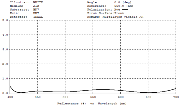 Generally, the higher the AR coating efficiency, the higher the cost. It is a trade-off between bandwidth, performance, and cost. For example, in Lidar applications operating at 905nm, it is possible to achieve R< 0.05% at 905nm with a bandwidth +/-5nm. It also theoretically possible to extend the range 800-1000nm and maintain R<0.05%. However, it becomes much more challenging to manufacture increasing cost. Designing for R<0.2% across this range may be a more cost-efficient solution. As a reasonable low-cost option, the most common visible coatings are specified at Ravg < 0.5%, over 400-700nm. Extended bandwidth options such as visible through Near Infra-Red to SWIR are also available. The theoretical best performance for coatings designed to cover 400nm to 1600nm, is about Ravg = 0.95%. Typically, coating providers will offer Ravg <1.5% to allow for manufacturing tolerances. Figure 3 illustrates a multilayer broadband AR coating at normal incidence over 400 – 1600nm. This specific coating is designed for low index glass types, in this case substrate is N-Bk7.