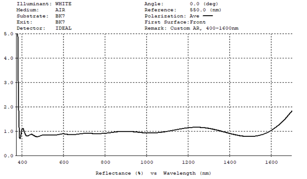 If we take a similar example of 400 – 1600nm and look to target more specific ranges - such as visible and two popular laser wavelengths 1064nm and 1550nm - a coating can be custom designed and manufactured to meet Ravg < 0.75% visible and R<0.5% at 1064nm and at 1550nm. This is a better manufacturable solution than Ravg < 1.5% across the full spectral range. Coatings can be modified to match other medium and higher index glass types with similar performances.