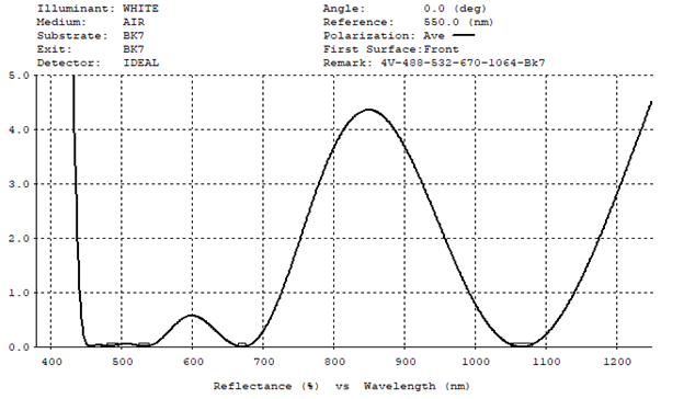 Custom designed coatings can be tailored to your specific performance requirements for around the same cost as more standard off the shelf coatings. Custom coatings include designs to reduce reflection at several “peak” specific wavelengths. The coating curve in figure 4 shows a coating designed to operate at low reflectance and at four different wavelengths: 488nm, 532nm, 670nm, and 1064nm.