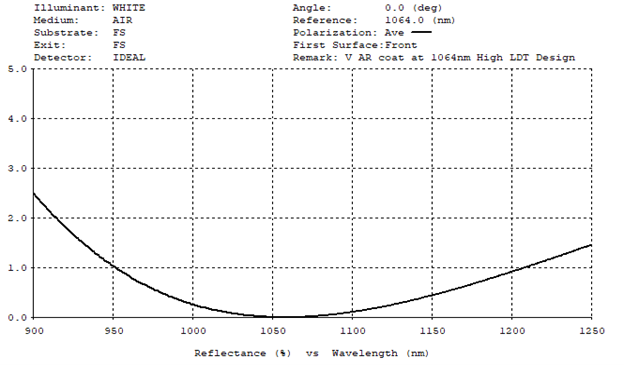 Commonly referred to as a “V” coating, figure 5 illustrates a design for high efficiency at a single wavelength. In this case the AR coating is designed to minimize reflection at 1064nm on fused silica and for a high laser damage threshold (LDT).